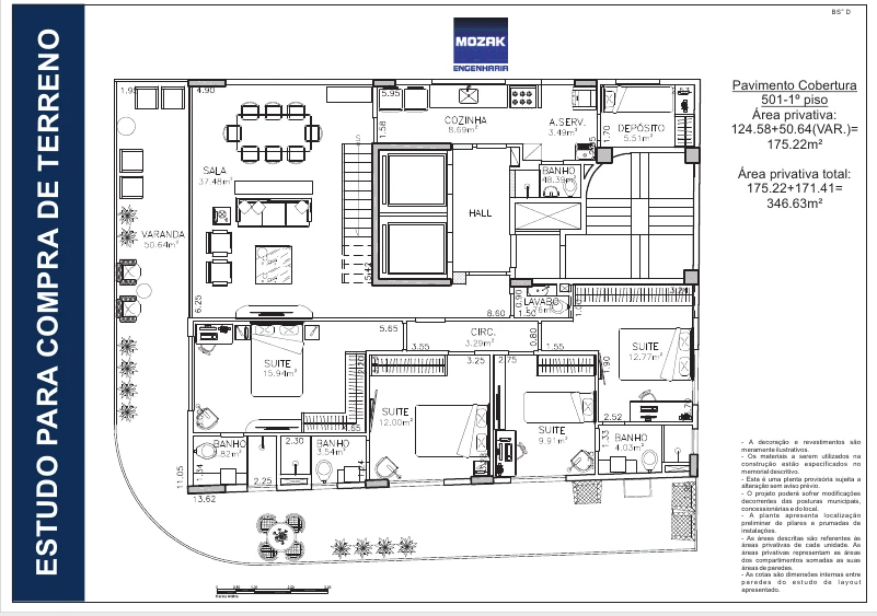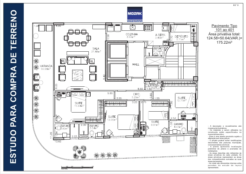 Apartamentos tipo 175m² com 4 suítes. 2 vagas de garagem.